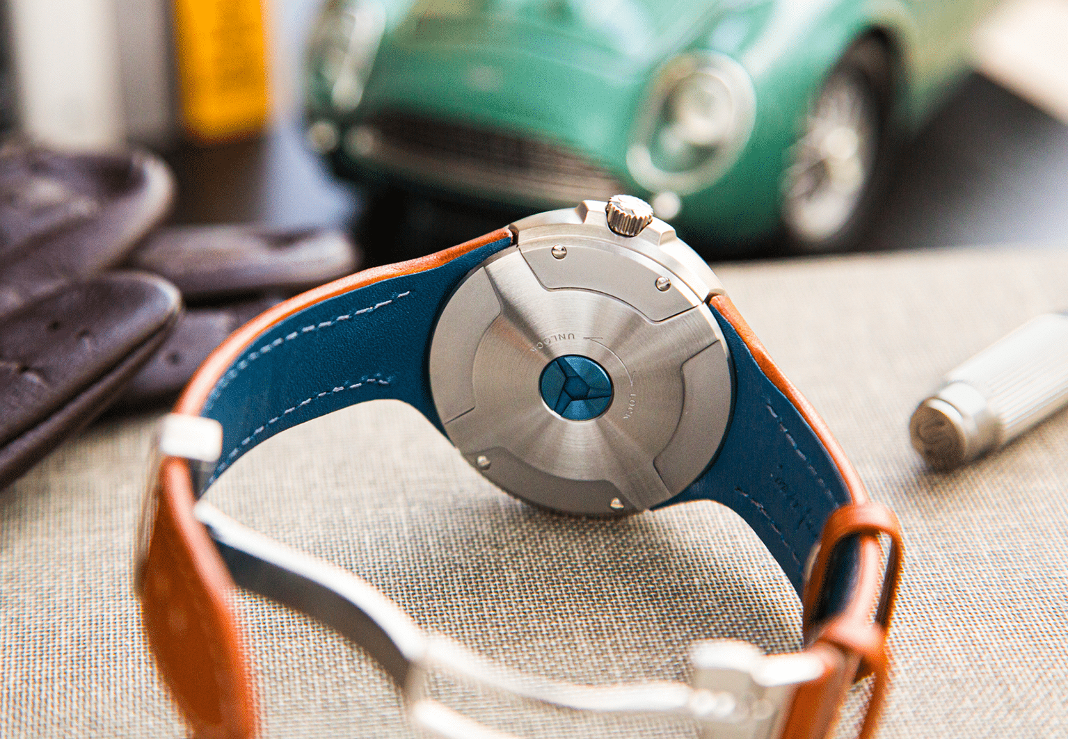 This approach is exemplified by a signature innovation: the Fastback™ system. It creates a seamless integration of the leather strap with the case, echoing the natural harmony between the interior leatherwork of an exceptional car and its bodywork. The strap is not merely an addition — it becomes a structural and aesthetic element of the watch itself.